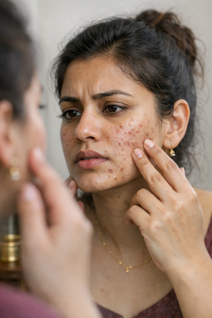 Acne scars form when severe acne damages the skin and underlying tissue. As the skin heals, it may leave behind depressions (pits), raised scars, or uneven texture.
